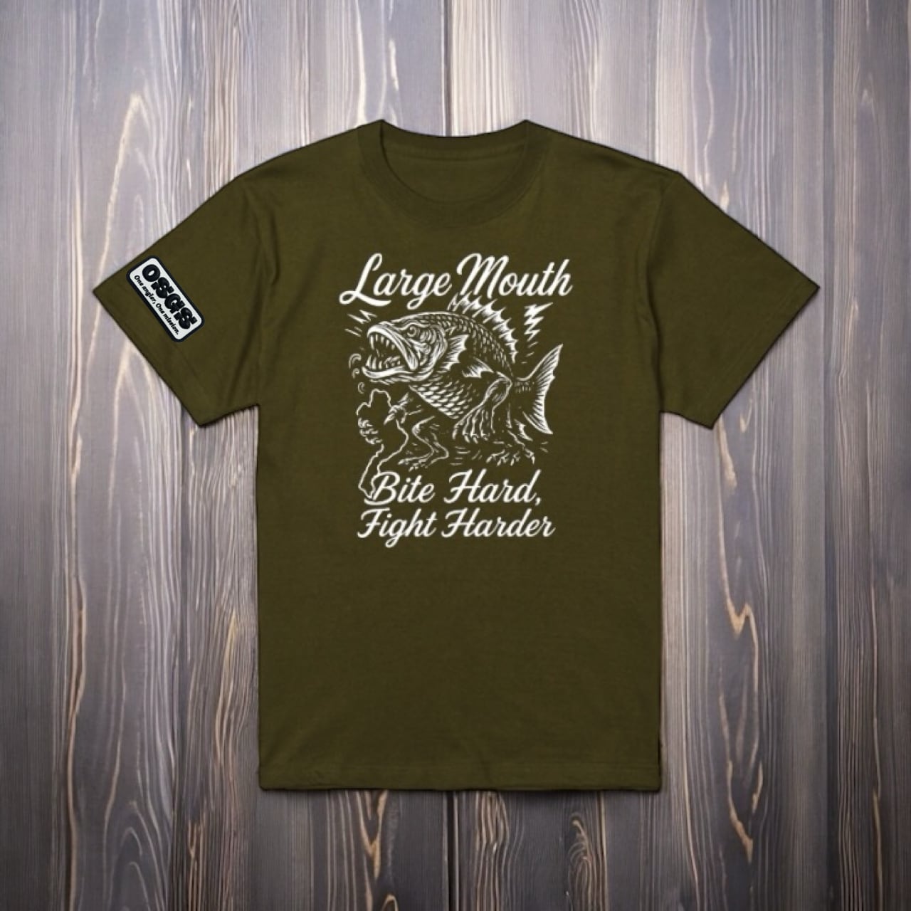 ラージマウスバスの力強さをヴィンテージ調で描いた一枚。Bite Hard, Fight Harderの言葉が挑戦心を刺激し、釣り人の誇りと闘志をさりげなく表現するTシャツです。