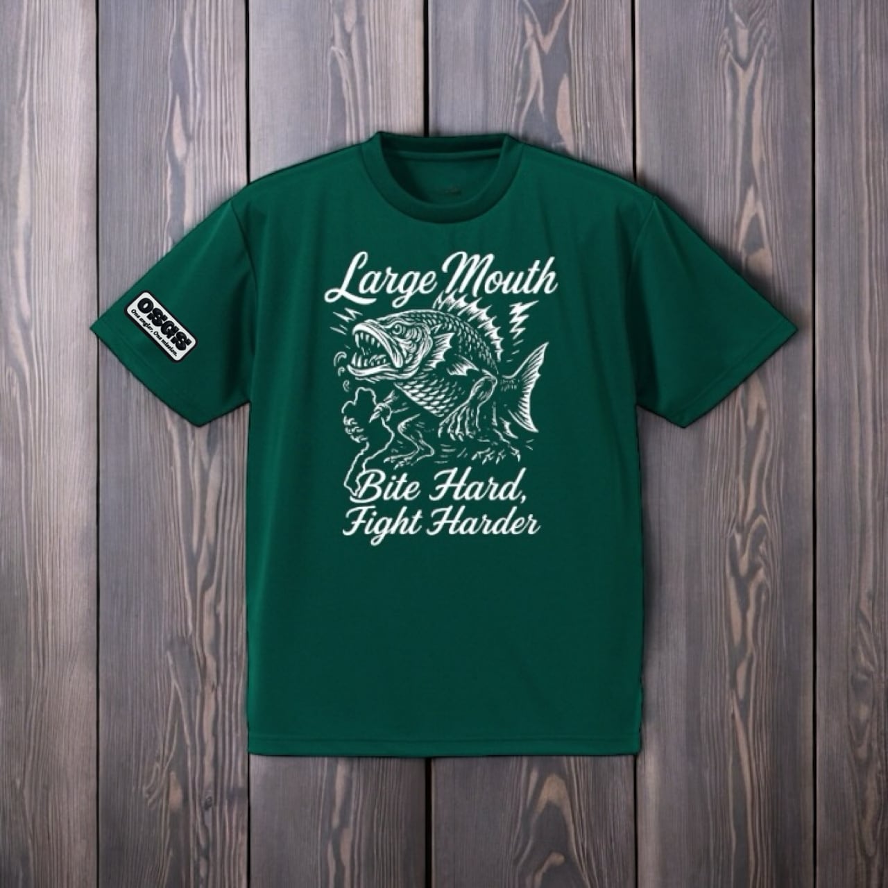 ラージマウスバスの力強さをヴィンテージ調で描いた一枚。Bite Hard, Fight Harderの言葉が挑戦心を刺激し、釣り人の誇りと闘志をさりげなく表現するTシャツです。
