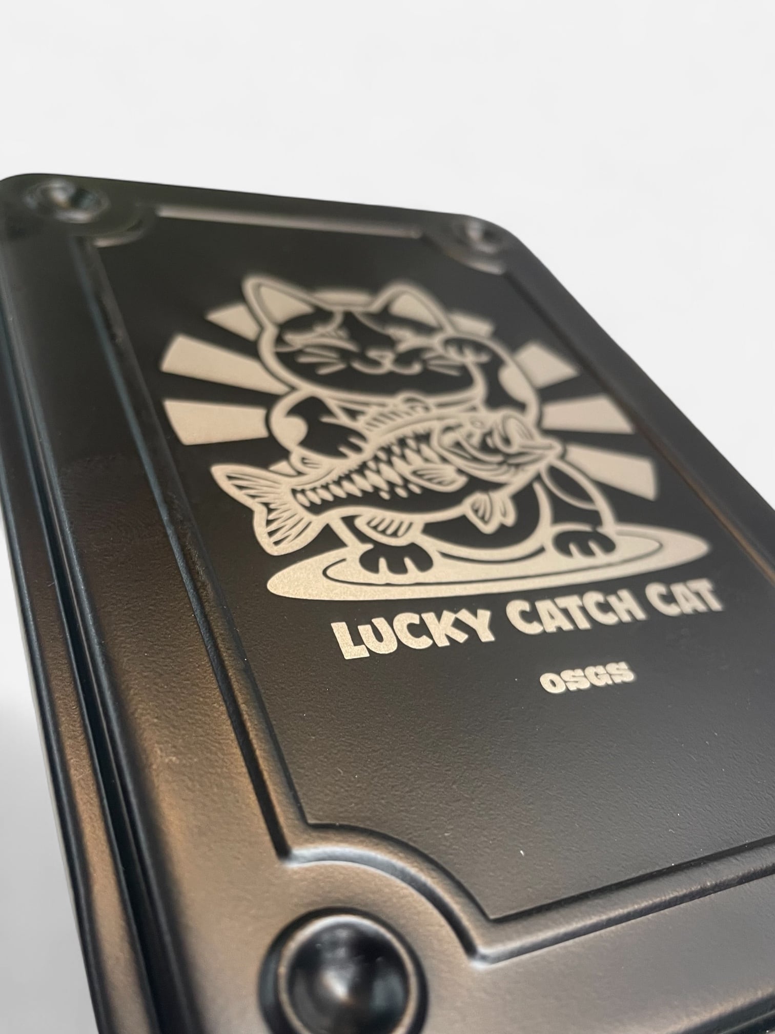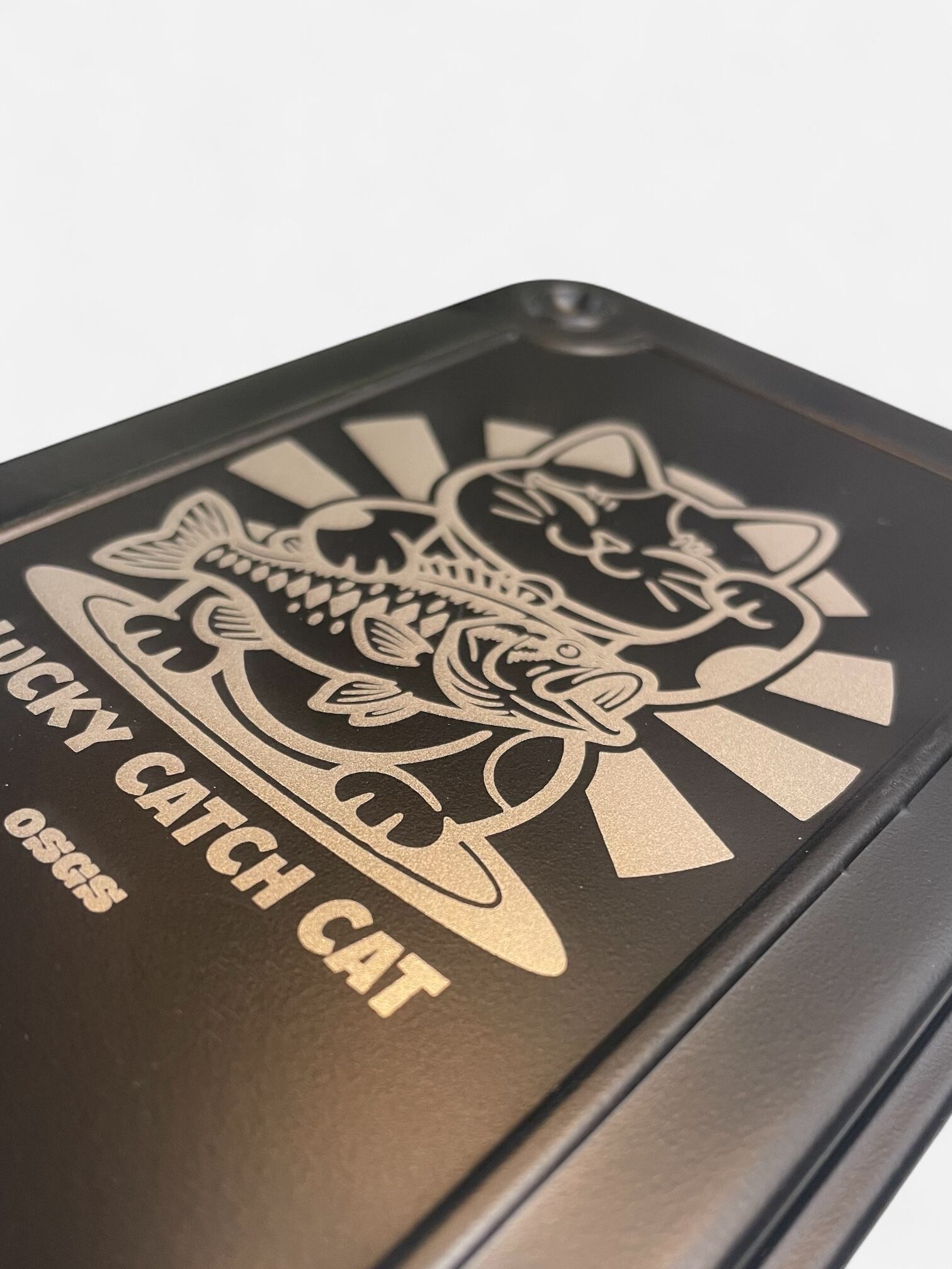 スチールボックスをレーザー彫刻によってアート作品へと昇華させました。デザインは魚を招く幸運の「魚招き猫」でございます。