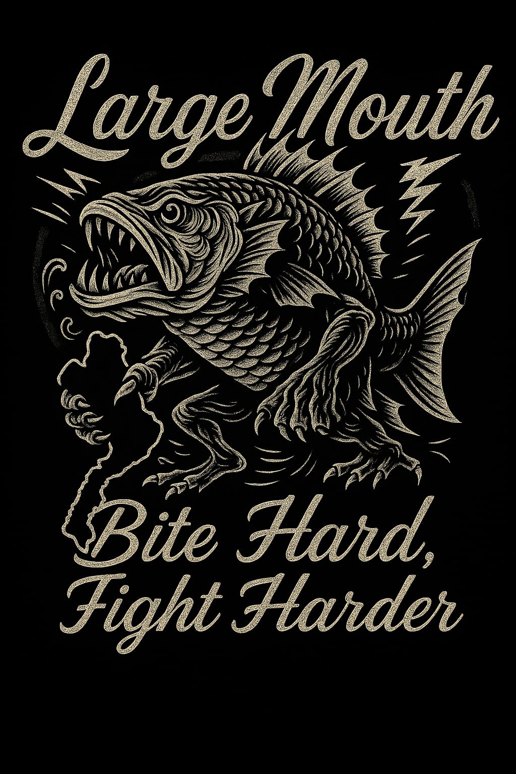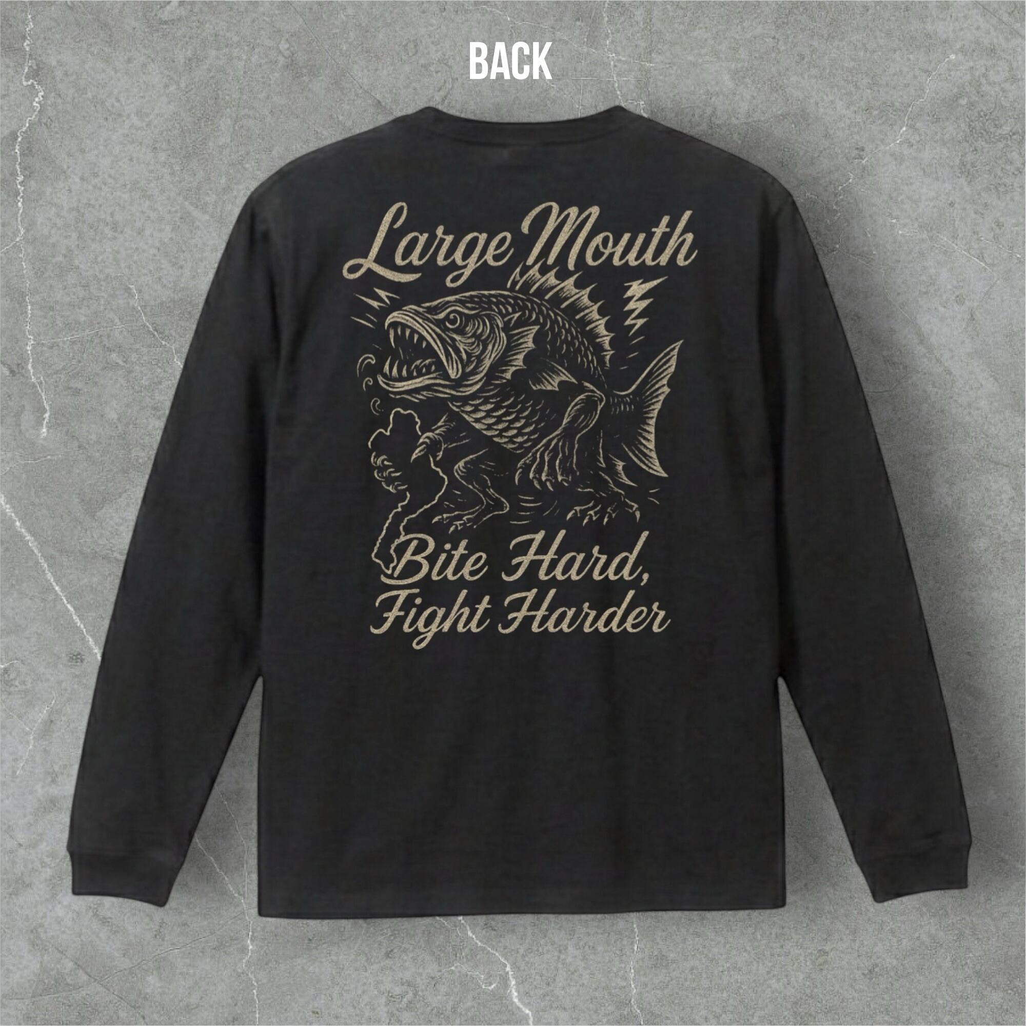 ラージマウスバスの力強さをヴィンテージ調で描いた一枚。Bite Hard, Fight Harderの言葉が挑戦心を刺激し、釣り人の誇りと闘志をさりげなく表現するTシャツです。